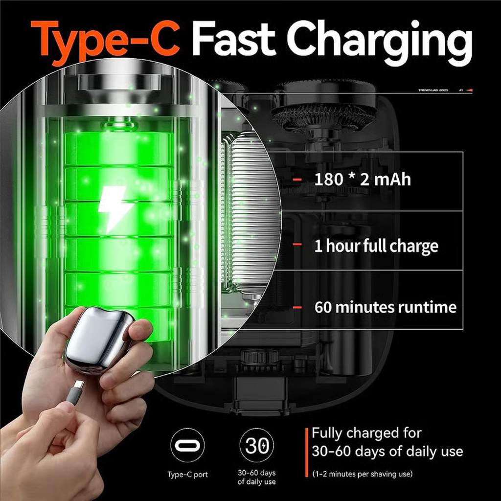 The motor speed is as high as 7500 rpm, which is twice that of ordinary electric shavers, and the shaving is accurate and safe. Even in the case of low power, the motor speed can be stabilized, effectively preventing the beard from getting stuck in the shaver, and realizing painless shaving.