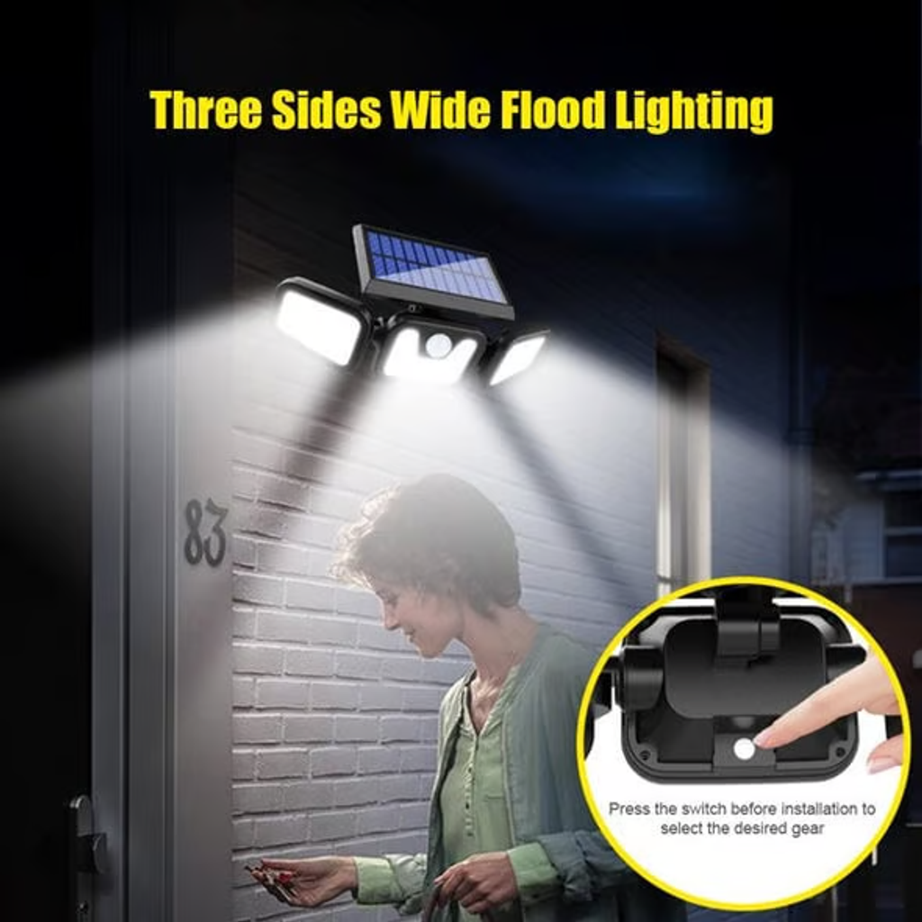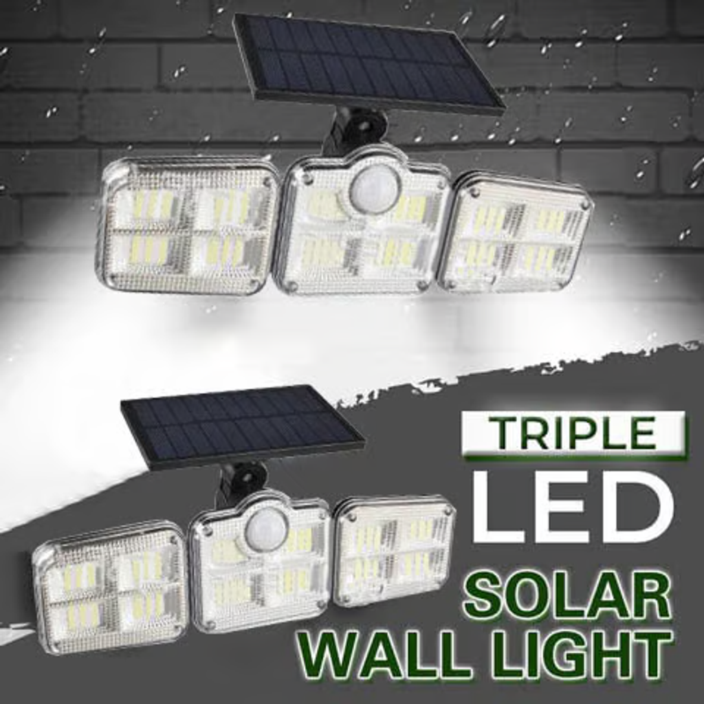 - Try this three-headed LED solar powered patio body sensor wall light! Solar power generation, automatic charging during the day, automatic lighting at night, energy saving and environmental protection, wide range of light, high brightness, 360 degrees rotatable spotlight, automatic human induction, good weather resistance, designed for outdoor use, so you can use it with more confidence!